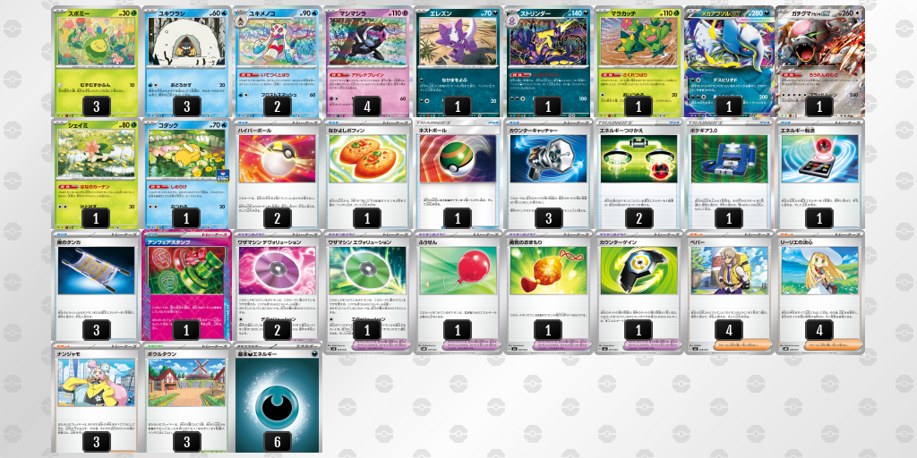 「スボミー」のグッズロックで相手の動きを止め、「ユキメノコ」の特性で場の特性持ちにどんどんダメカンを乗せていく。その際自分にもダメカンが乗る「マシマシラ」の特性で相手にダメカンをさらに乗せ、じわじわと相手を追い詰めていくデッキです。