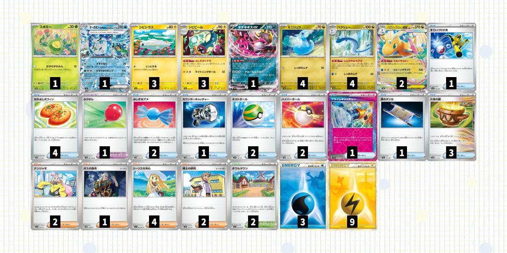 「シビビール」の特性「エレキダイナモ」で雷エネを加速し、「メガカイリューex」の「リューノグライド」330ダメージで相手を一撃で倒していくデッキ。
