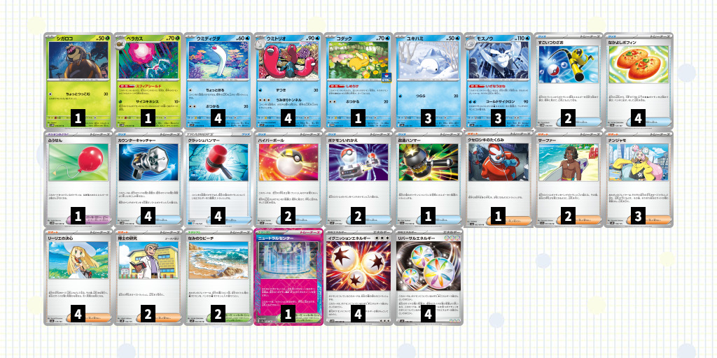 「モスノウ」の特性を発動させるためにはバトル場に出る必要があるので、「なみのりビーチ」「ポケモンいれかえ」「サーファー」を2枚ずつ採用。特に「なみのりビーチ」は同じ水タイプの「ウミトリオ」と相性がいいので、手札に来たらすぐにでも出したいスタジアムです。
