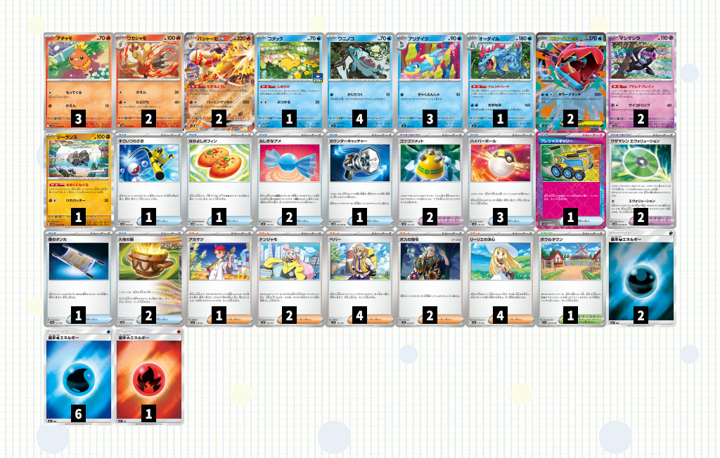 「メガオーダイルex」の「キラークランチ」で400ダメージを出し、どんな相手でも一撃でなぎ倒していこうというデッキです。