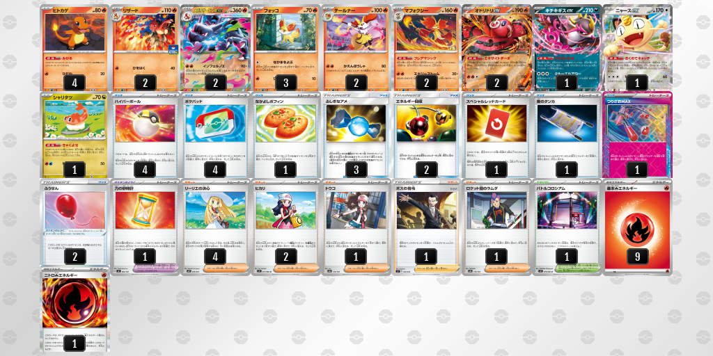 今の環境は「スピアーex」「オリーヴァex」「メガフシギバナex」など草ポケモンが徐々に増えてきた環境なので、そこに弱点を突ける数少ない強力な炎デッキとなっています。
