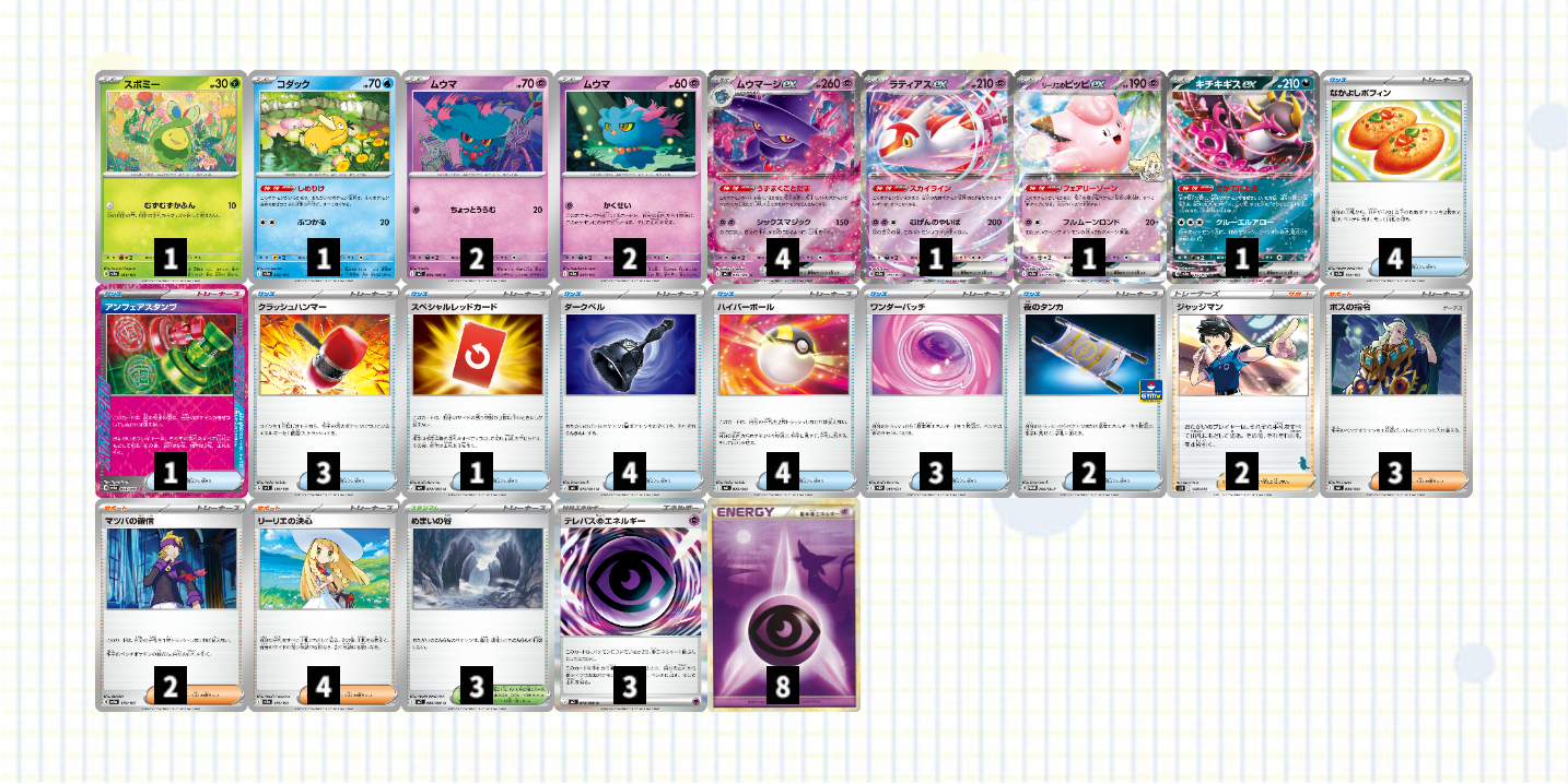 ほかのアタッカーも欲しいところですが、いったんシンプルにこんらんを押し付ける「ムウマージex」軸の構築にしてみました!