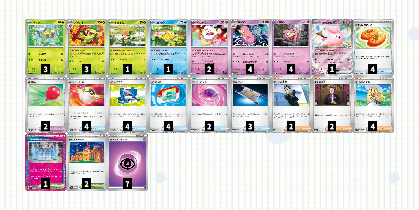 また、「リーリエのピッピex」は「ヤドラン」の攻撃が“ドラゴンタイプに弱点になる”、という役割以外にも、“手札が0枚にならなかった時のアタッカーになる”というサブアタッカー的な役割も持たせています。ここは2枚にするか、考えどころです。